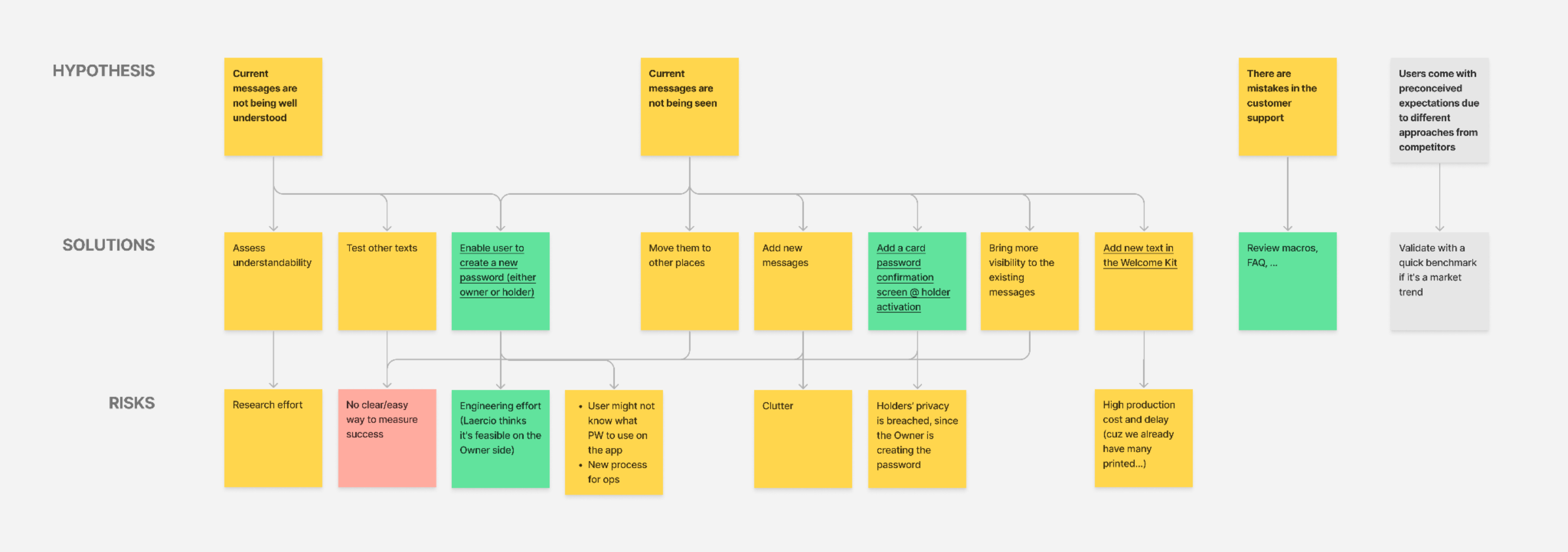 Mapping of hypothesis, solutions and risks related to the password issue.
