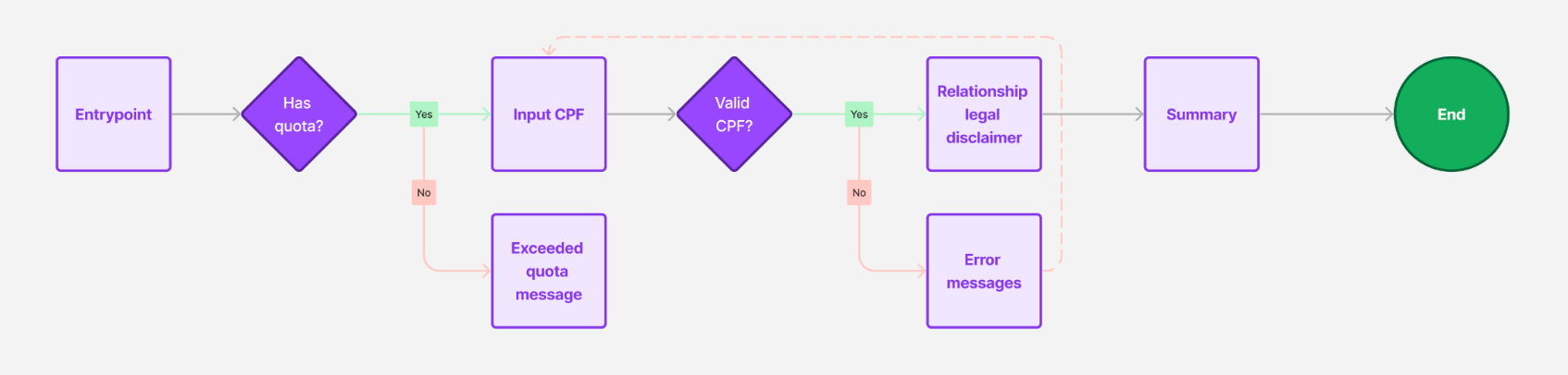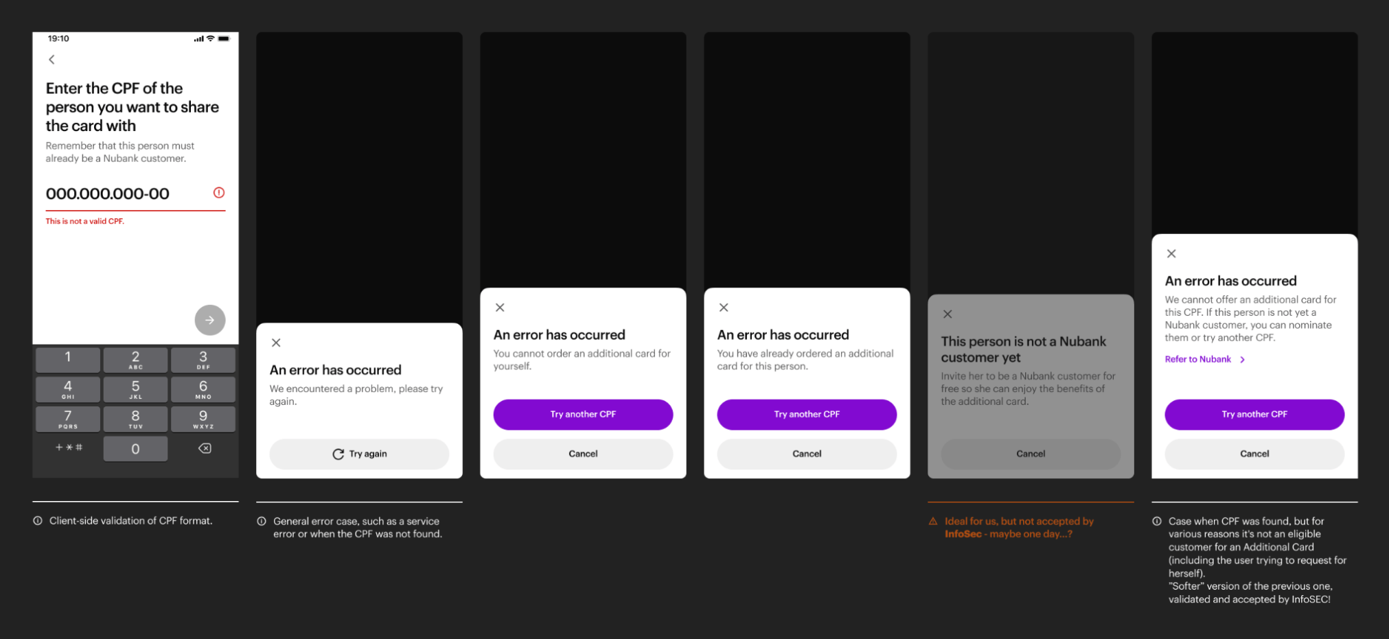 Since this flow is open to all users, it was really tricky thinking on what we could and couldn’t inform to the user about that CPF. If we inform too much, bad actors can use this flow to reveal personal information about that CPF. If we reveal too little, users can be confused.