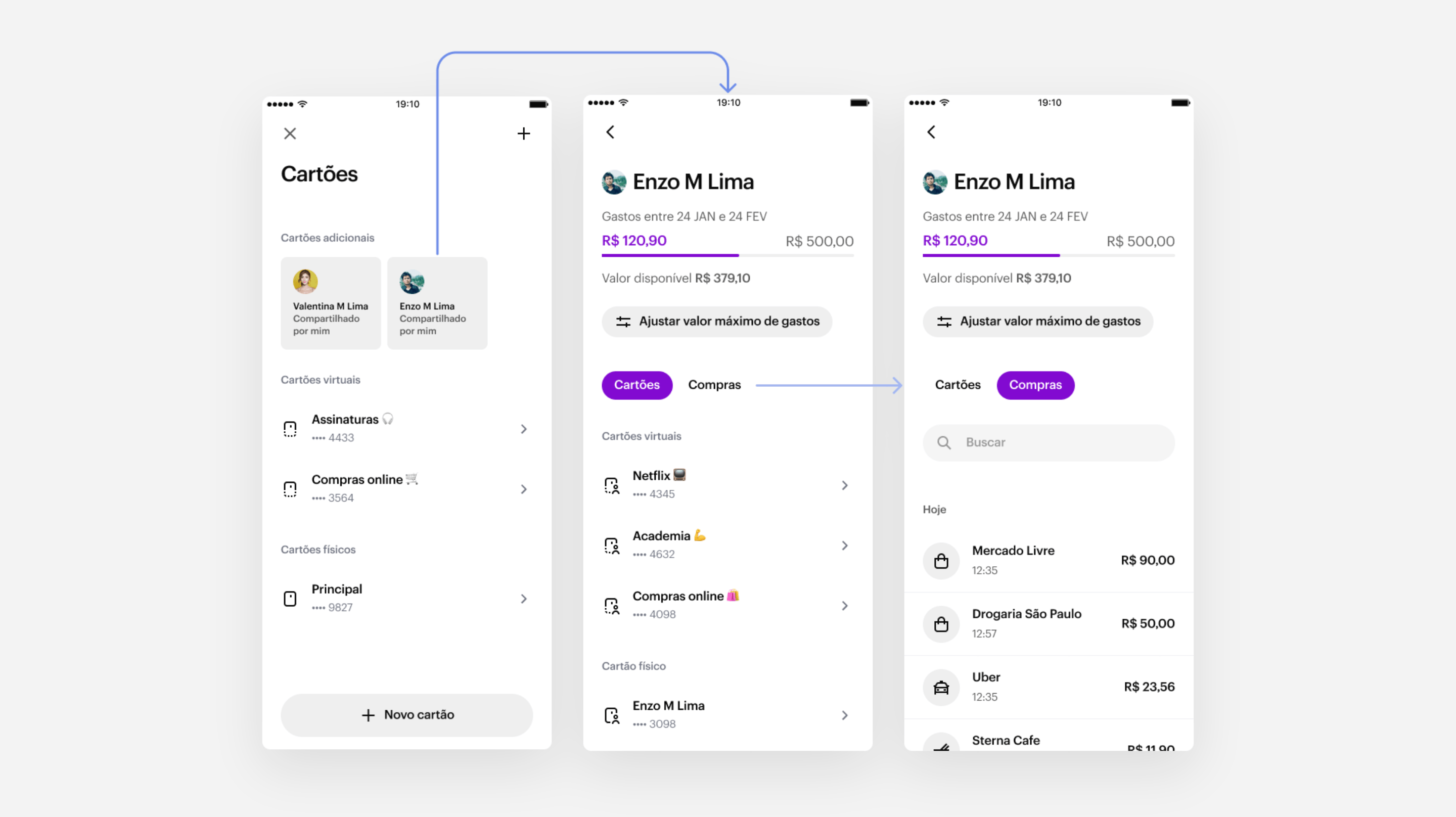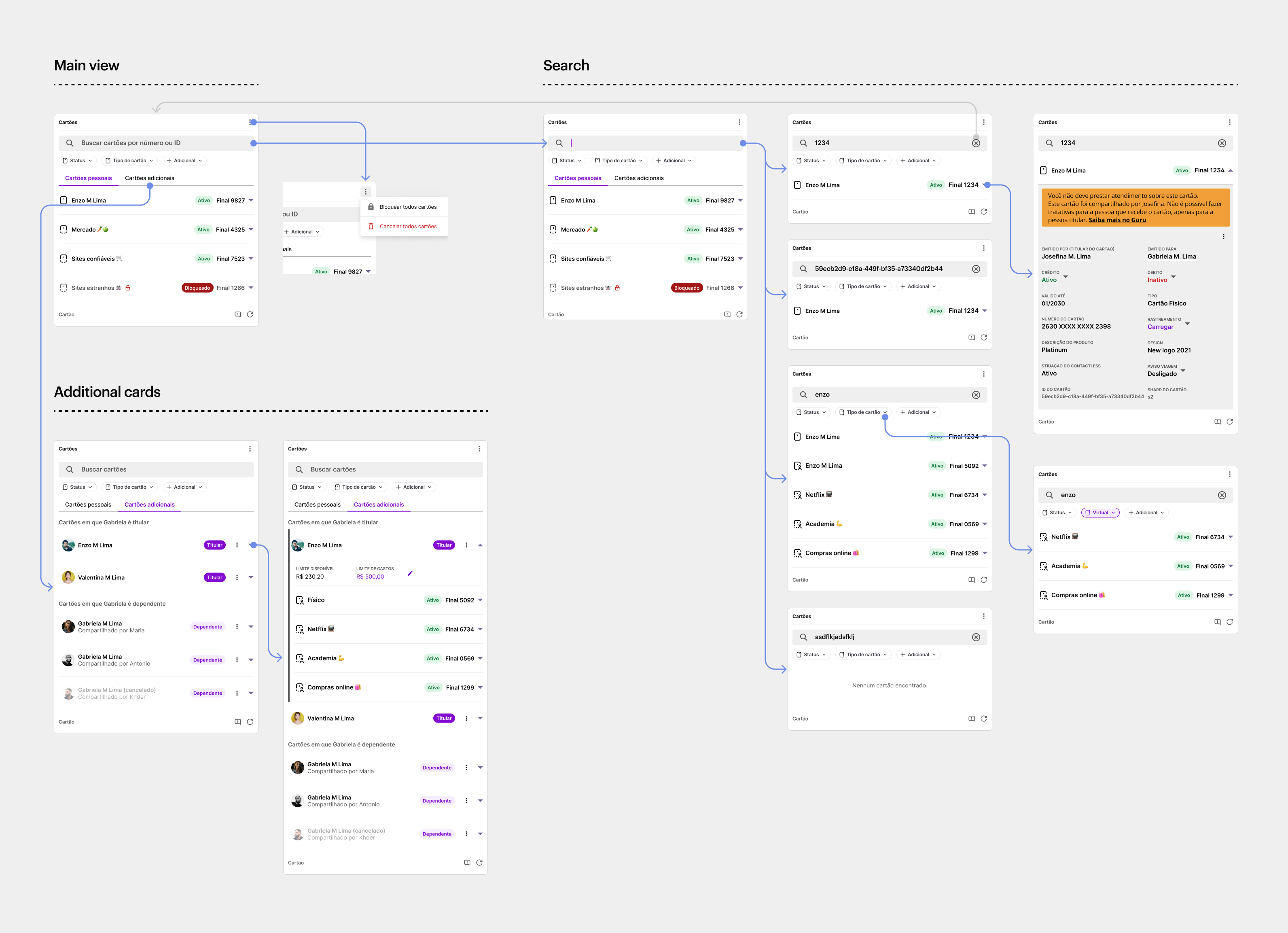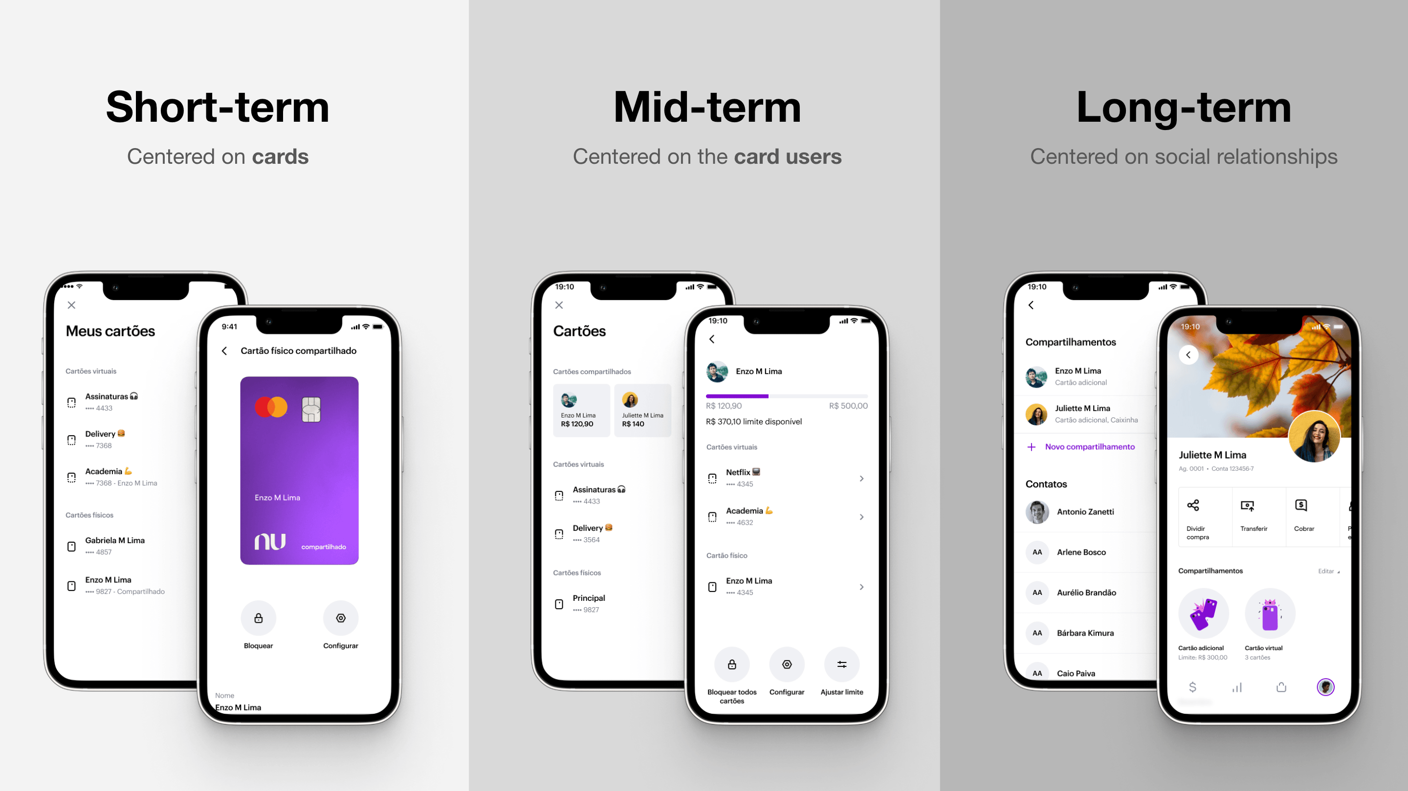 In collaboration with the Marketing and Brand teams, we explored many ideas such as new shapes, colors, and extra icons on the card design. After many alignments and a Design Review with the VP of Design, we moved forward with a solution that is very elegant in its simplicity: an extra label on the back of the card saying “compartilhado por” (“shared by”) followed by the card owner’s name. Not only this helps differentiate among multiple cards, but users mentioned this design values the emotional bond between the two people.