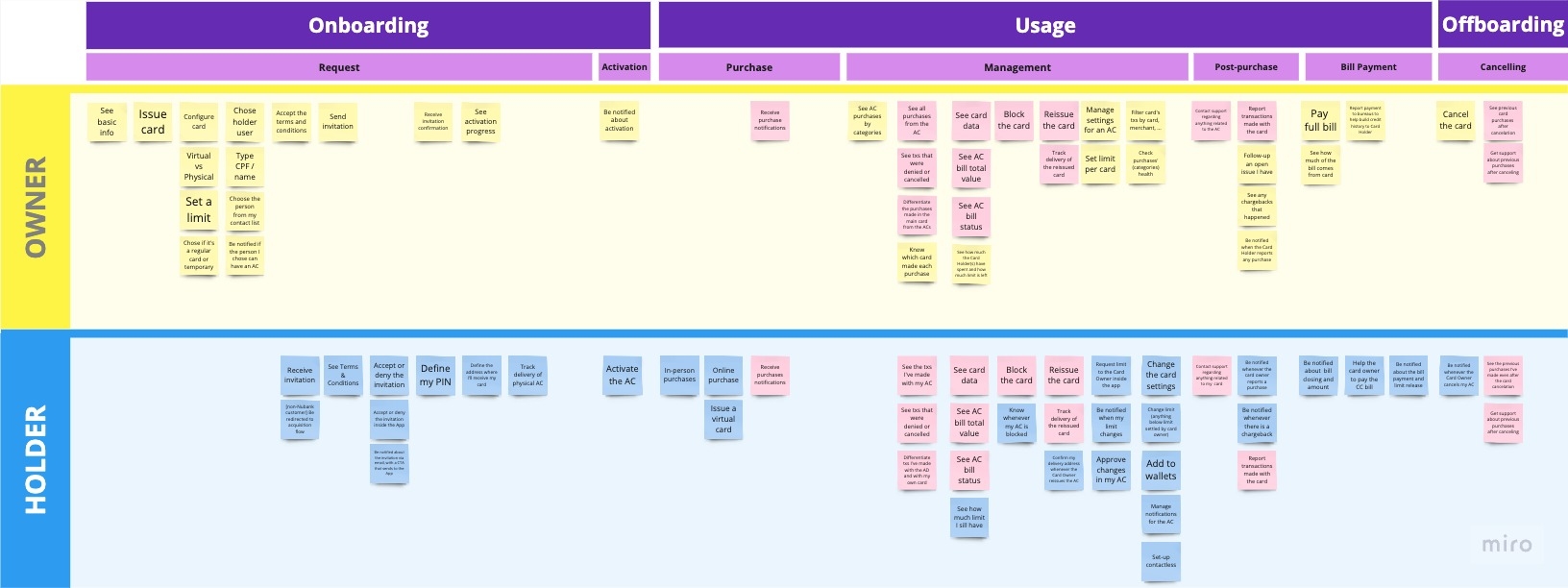 This project aimed at building two full user experiences. This is where the complexity of this product starts to show: not only do we have to design and implement an entirely new credit card product, but we also have to consider two sides that have things in common but also significant differences. In collaboration with the Product Manager, we mapped the needs of these two users: