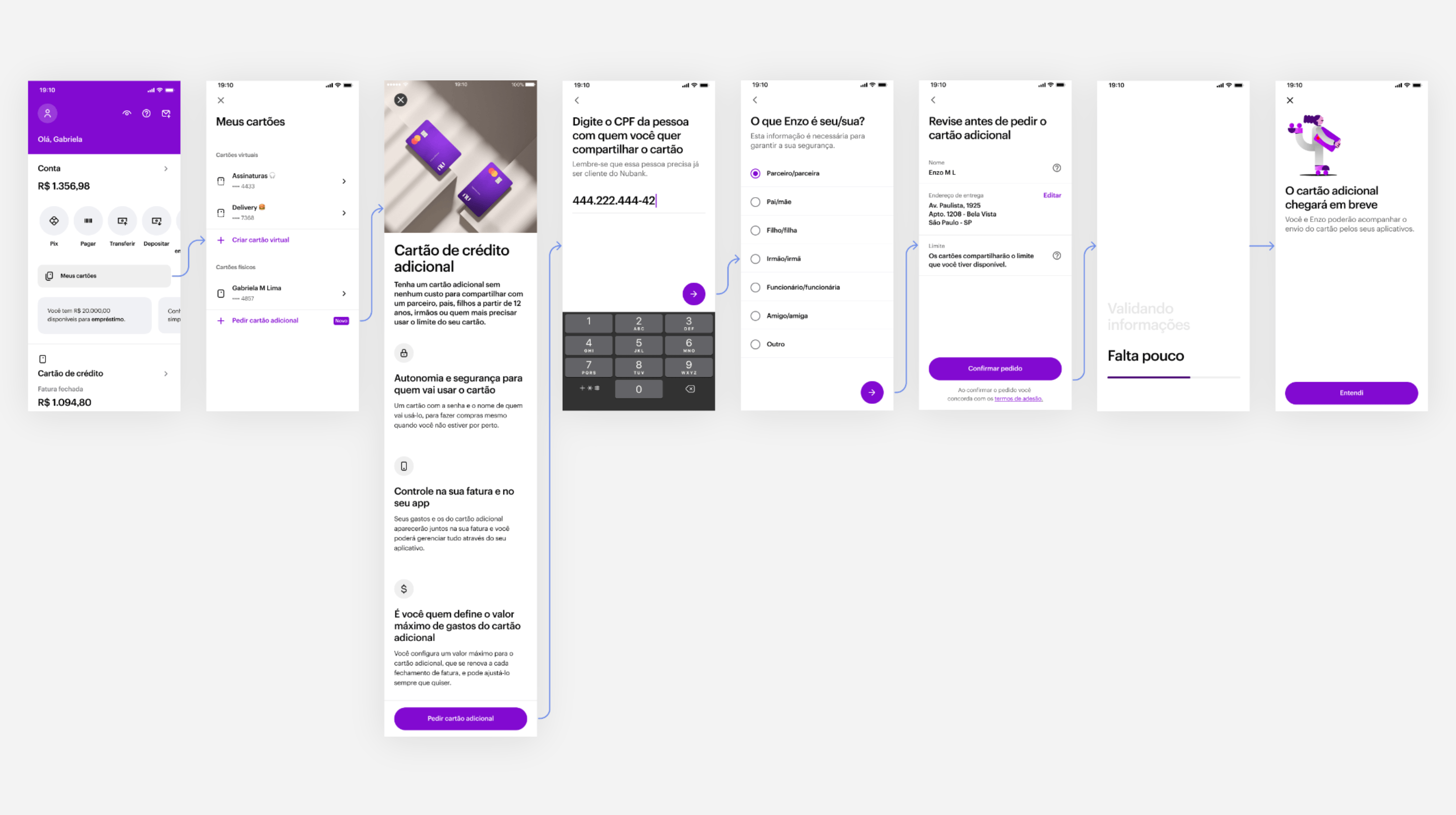 I started with the request flow. My objective was to make it as simple as possible while not compromising transparency with the customer. With the constraint of only being able to offer Additional Cards to those who are already a client, all we needed was the Holder’s CPF number (it’s like a Brazilian social security number).