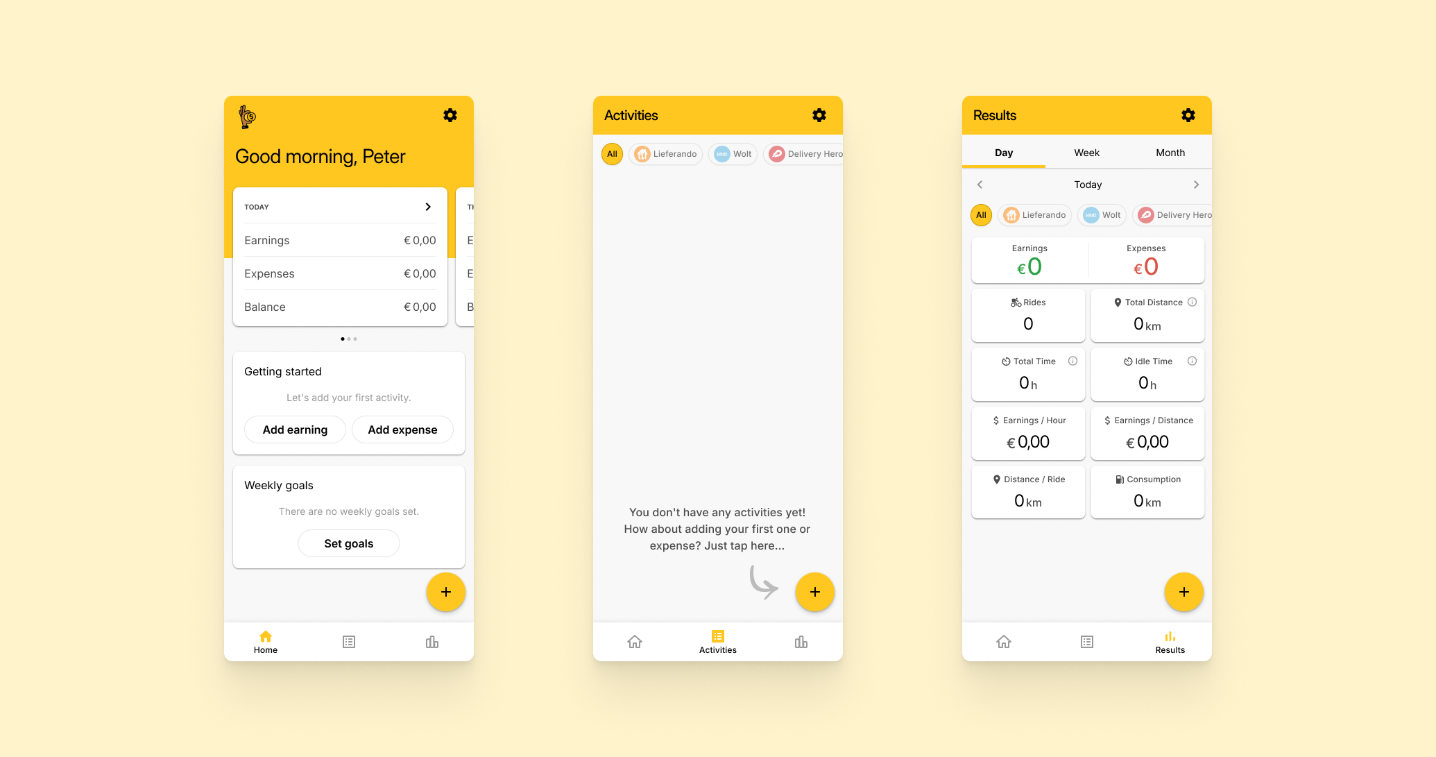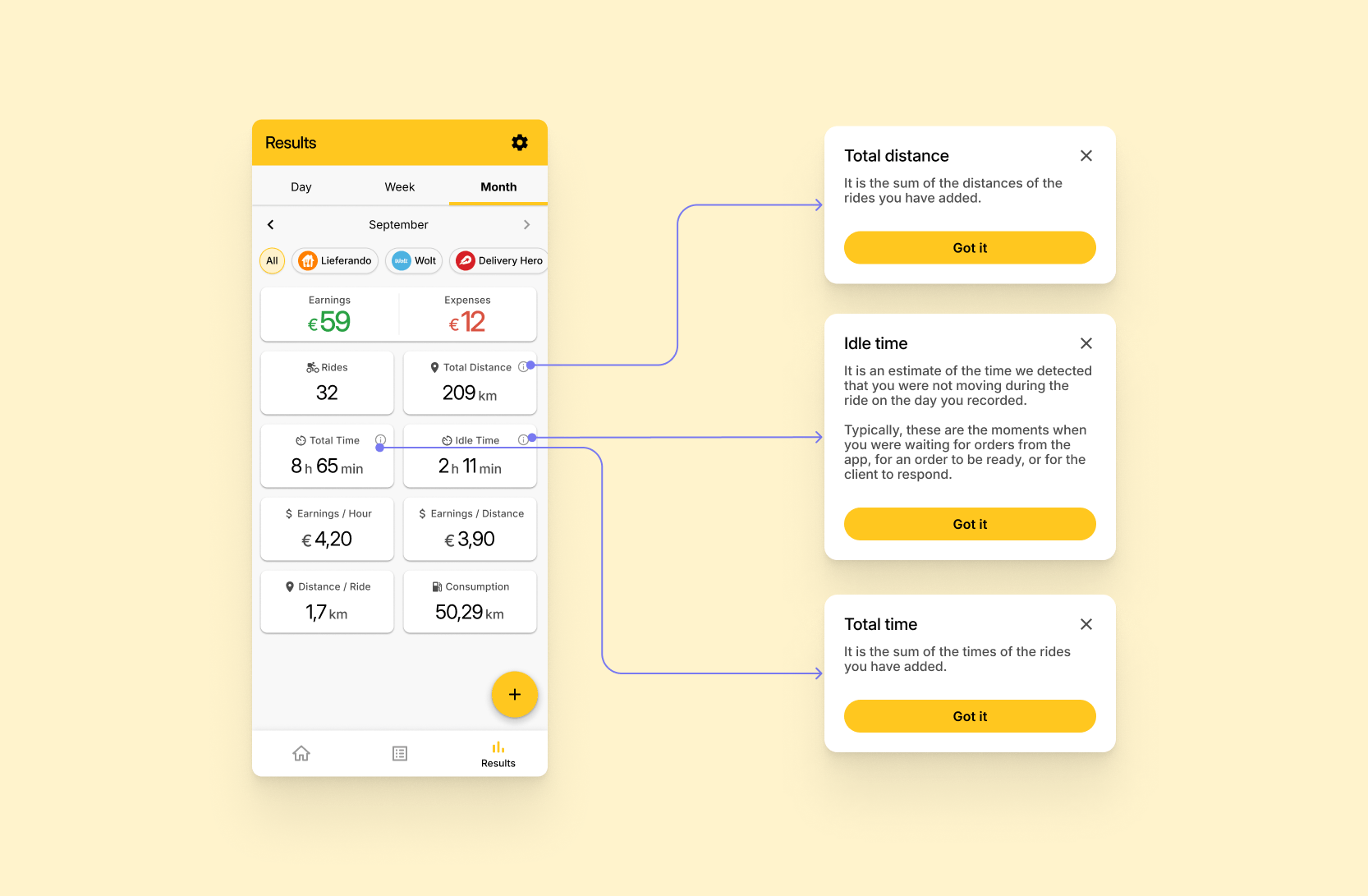 Automatically import rides’ data from different delivery platforms. A highly requested feature since the first research, this feature proved to be way too costly for our MVP, but after the launch we’ll seek funding to implement it.